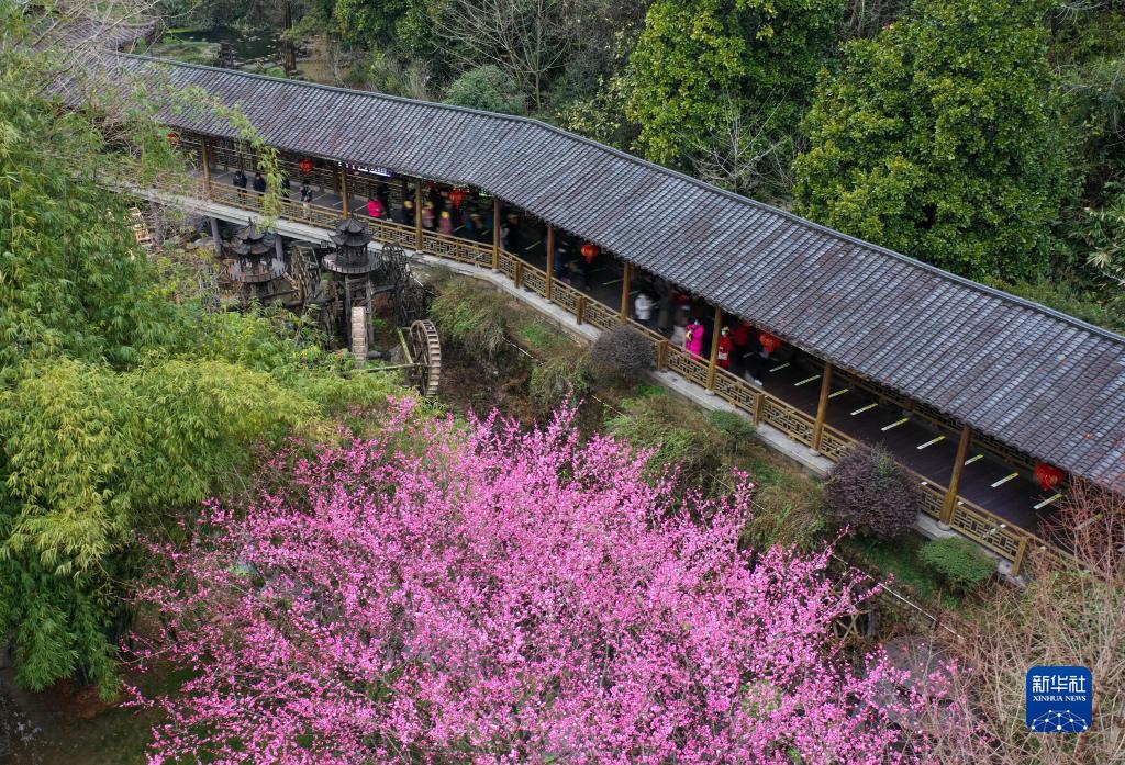 春回大地,在湖南省張家界市武陵源區黃龍洞景區,梅花爭艷綻放,春意盎然,吸引人們來(lái)到戶(hù)外踏春賞花,樂(lè )享春光。