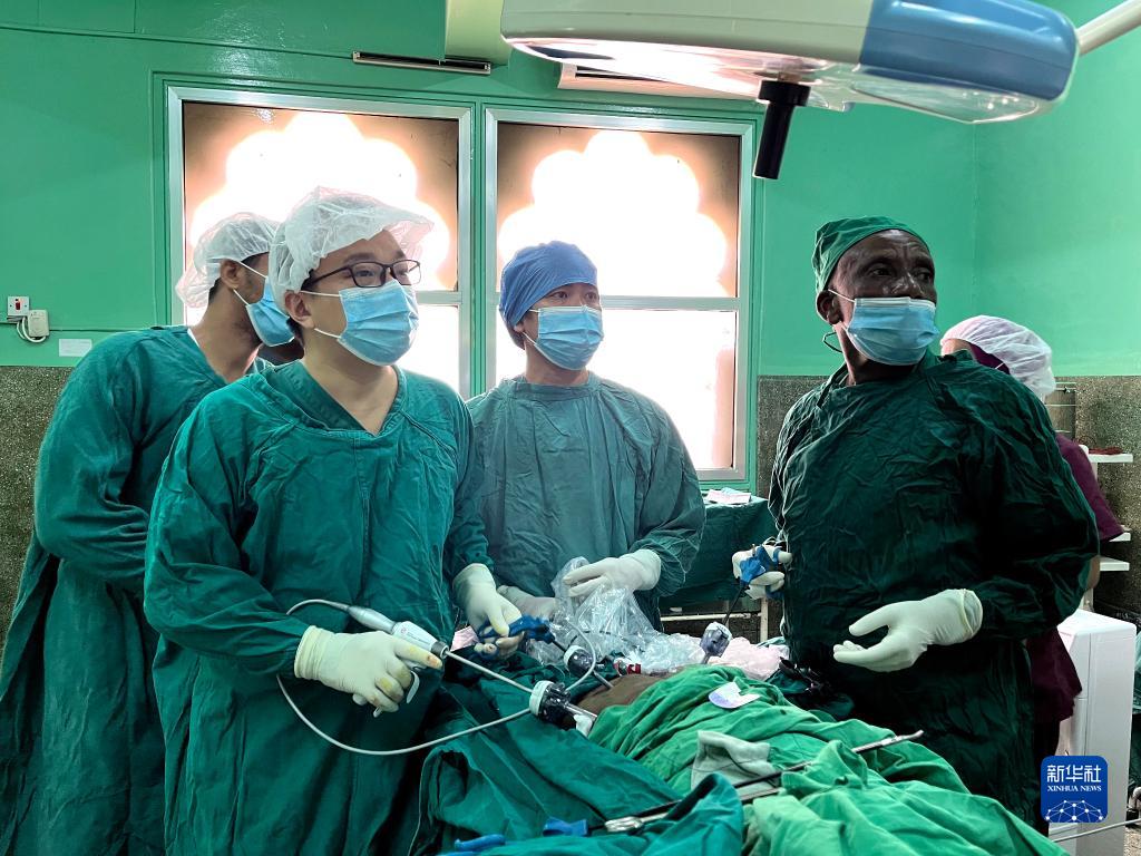 2022年12月6日,在坦桑尼亞桑給巴爾島納茲莫加醫院,第32期中國援桑給巴爾醫療隊隊長(cháng)、普外科醫生趙小軍(前左)進(jìn)行腹腔鏡手術(shù)教學(xué)。