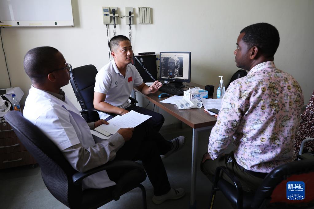 2月22日,在坦桑尼亞桑給巴爾島納茲莫加醫院,泌尿外科醫生郭偉(左二)給病人看病。