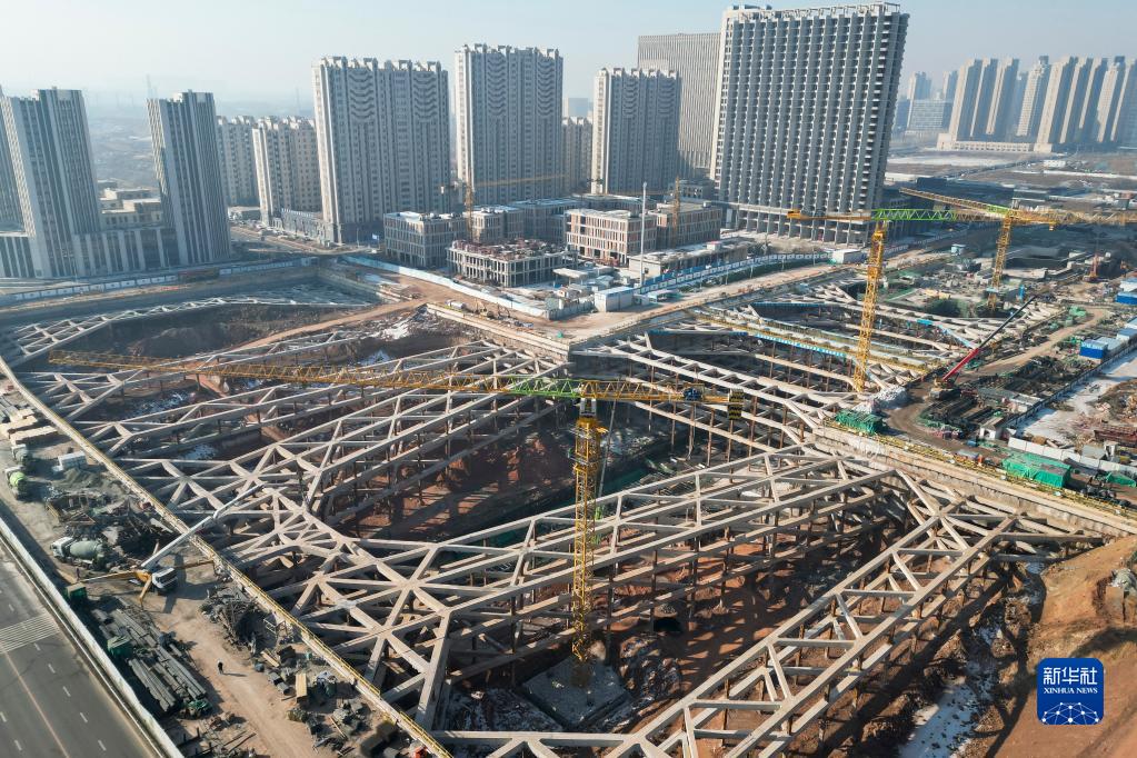 2月23日拍攝的長(cháng)春市城市軌道交通6號線(xiàn)03標段三工區華慶路站施工現場(chǎng)(無(wú)人機照片)。