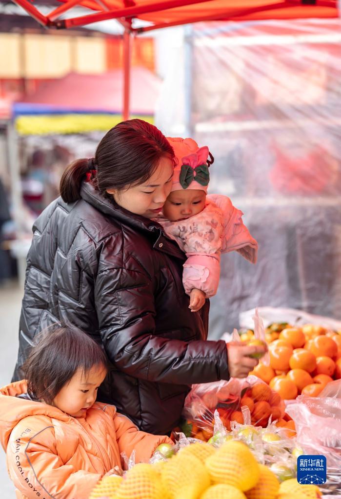 2月23日,一名顧客帶著(zhù)孩子在貴州省黔西市錦星鎮集市選購水果。