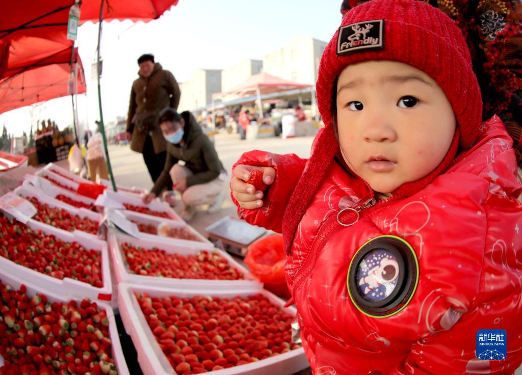 2月24日,在河南省商丘市寧陳農貿市場(chǎng),顧客準備給孩子買(mǎi)草莓。