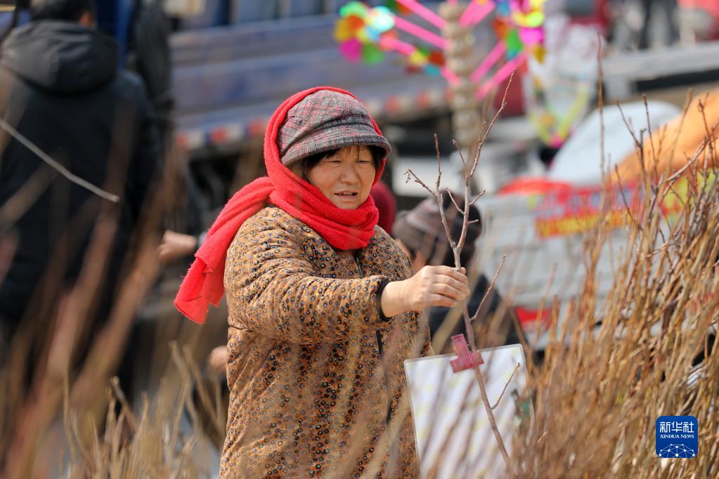 2月24日,在山東省臨沂市郯城縣郯城街道東南村集市,村民在選購苗木。
