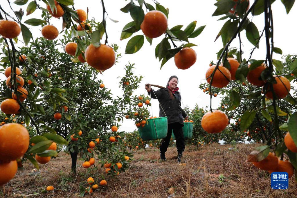 2月23日,在貴州省黔東南苗族侗族自治州榕江縣忠誠鎮正樂(lè )村沃柑種植基地,村民在挑運沃柑。