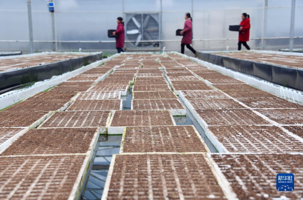 2月23日,在湖北省恩施土家族苗族自治州宣恩縣椒園鎮一處蔬菜專(zhuān)業(yè)合作社的智能溫控大棚,農戶(hù)在搬運育苗盤(pán)。