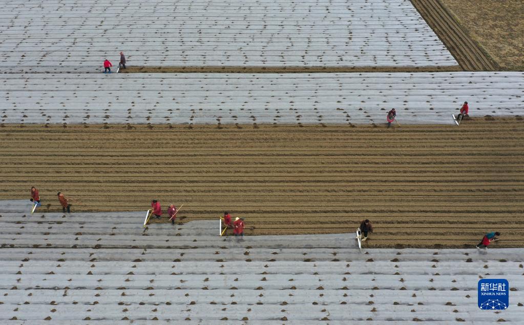 2月23日,四川省眉山市東坡區松江鎮農民在為春蘿卜覆膜(無(wú)人機照片)。