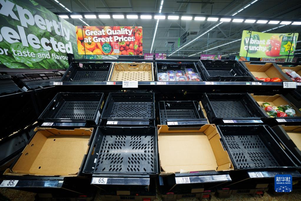 2月23日,在英國曼徹斯特,一家超市的水果和蔬菜貨架出現缺貨。