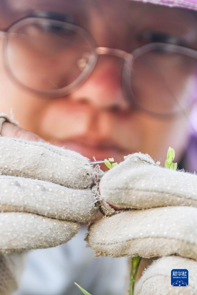2月22日,青島海水稻研究發(fā)展中心的科研人員于萌在三亞的國家南繁科研育種基地里做水稻雜交實(shí)驗。