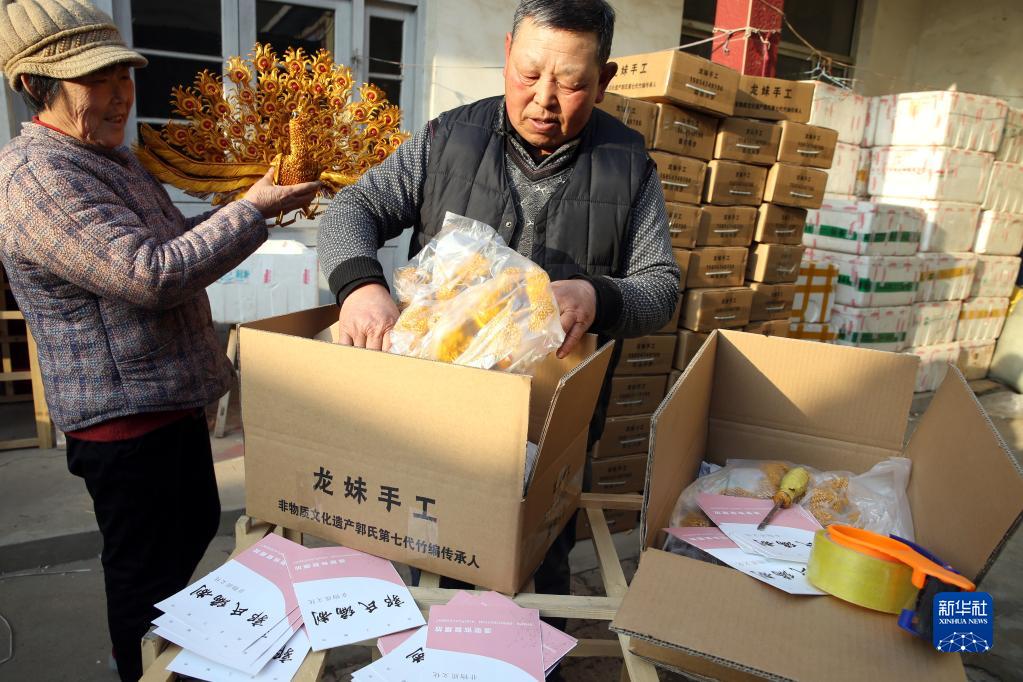 2月23日,濱州市沾化區下洼鎮村民安春華(右)夫婦在打包鋁編工藝品,準備寄出。