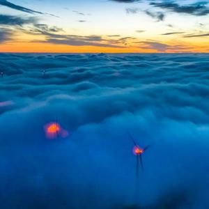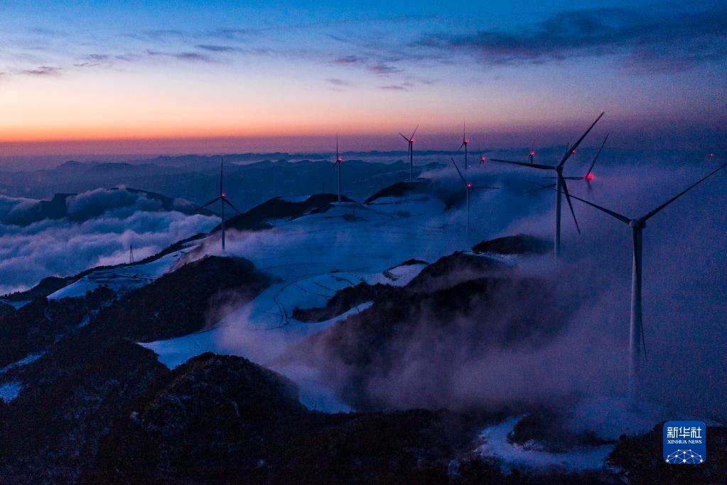 一場(chǎng)春雪過(guò)后,湖北省宜昌市秭歸縣云臺荒風(fēng)力發(fā)電場(chǎng)銀裝素裹,風(fēng)電機組在云海中旋轉,美景如畫(huà)。