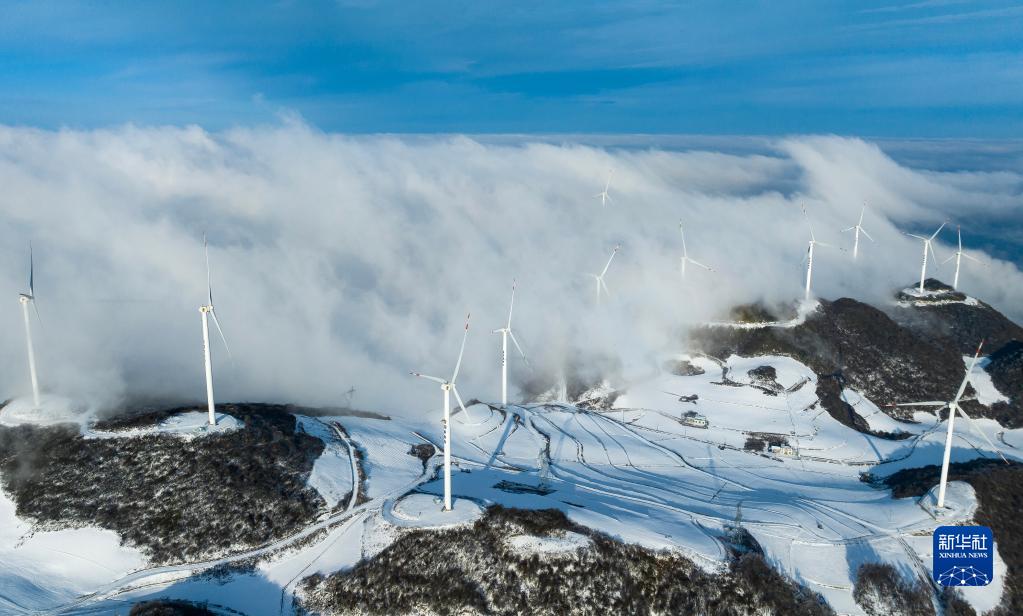 一場(chǎng)春雪過(guò)后,湖北省宜昌市秭歸縣云臺荒風(fēng)力發(fā)電場(chǎng)銀裝素裹,風(fēng)電機組在云海中旋轉,美景如畫(huà)。