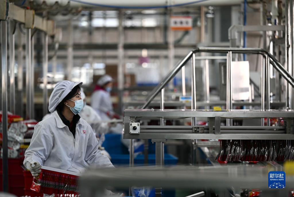 工作人員在天津市利民調料有限公司辣醬灌裝生產(chǎn)線(xiàn)操作機械設備(2月20日攝)。