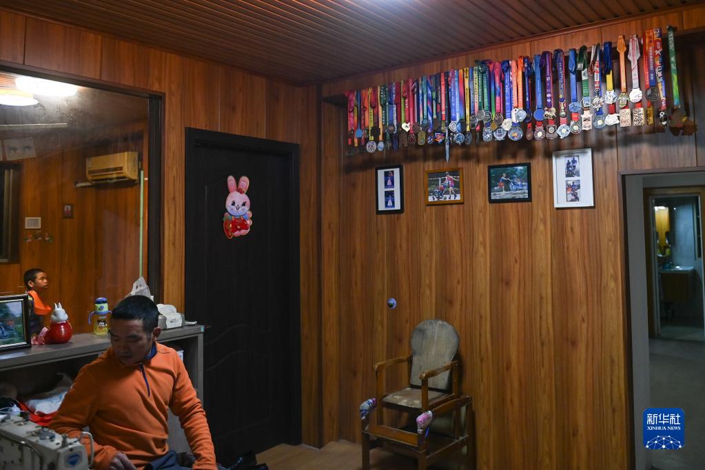 在小柏房間門(mén)口的墻上,掛著(zhù)父子倆參賽的紀念獎牌及照片(2月23日攝)。