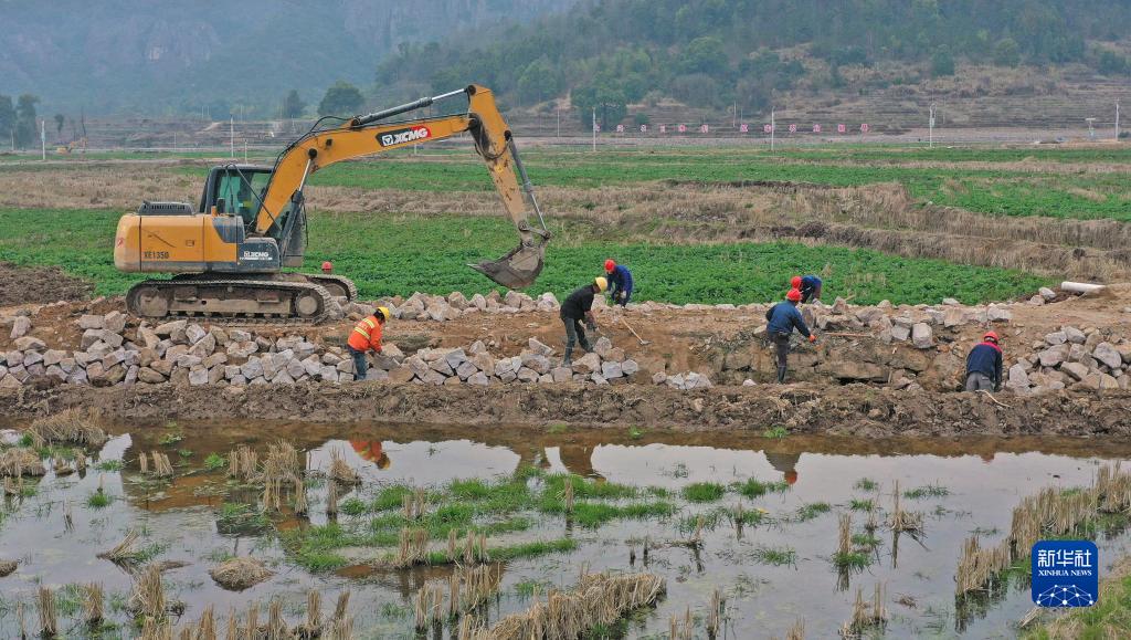 2月24日,施工人員在浙江省臺州市仙居縣雙廟鄉農田修建灌溉水渠和硬化機耕道路(無(wú)人機照片)。