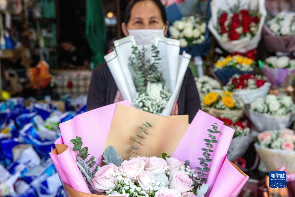 2月21日,商販在泰國曼谷帕空鮮花市場(chǎng)展示來(lái)自云南的鮮花。