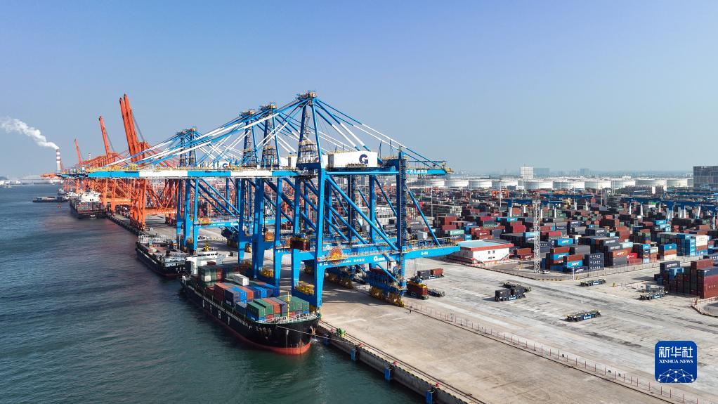 2月25日,海輪??繌V西欽州港自動(dòng)化集裝箱碼頭卸貨(無(wú)人機照片)。