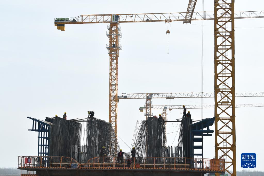 2月24日,中鐵十八局工人在位于西安市周至縣的陜西引漢濟渭工程渭河管橋施工現場(chǎng)工作。