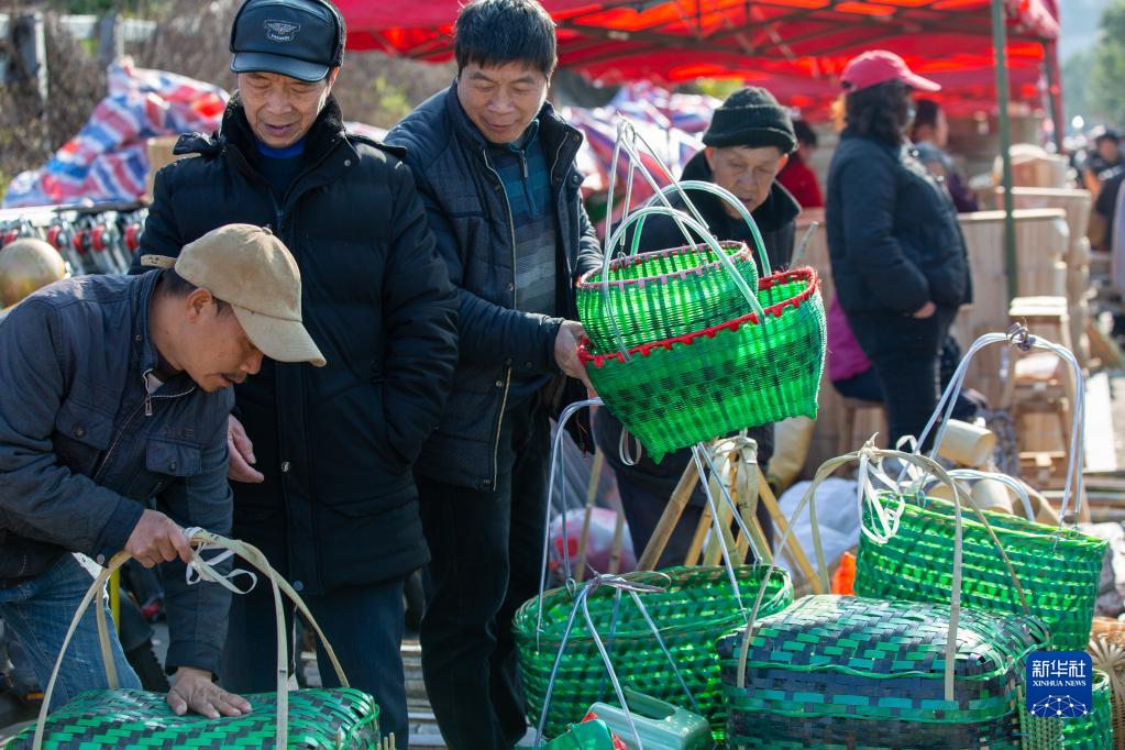 2月25日,人們在武夷山“柴頭會(huì )”上挑選竹籃。