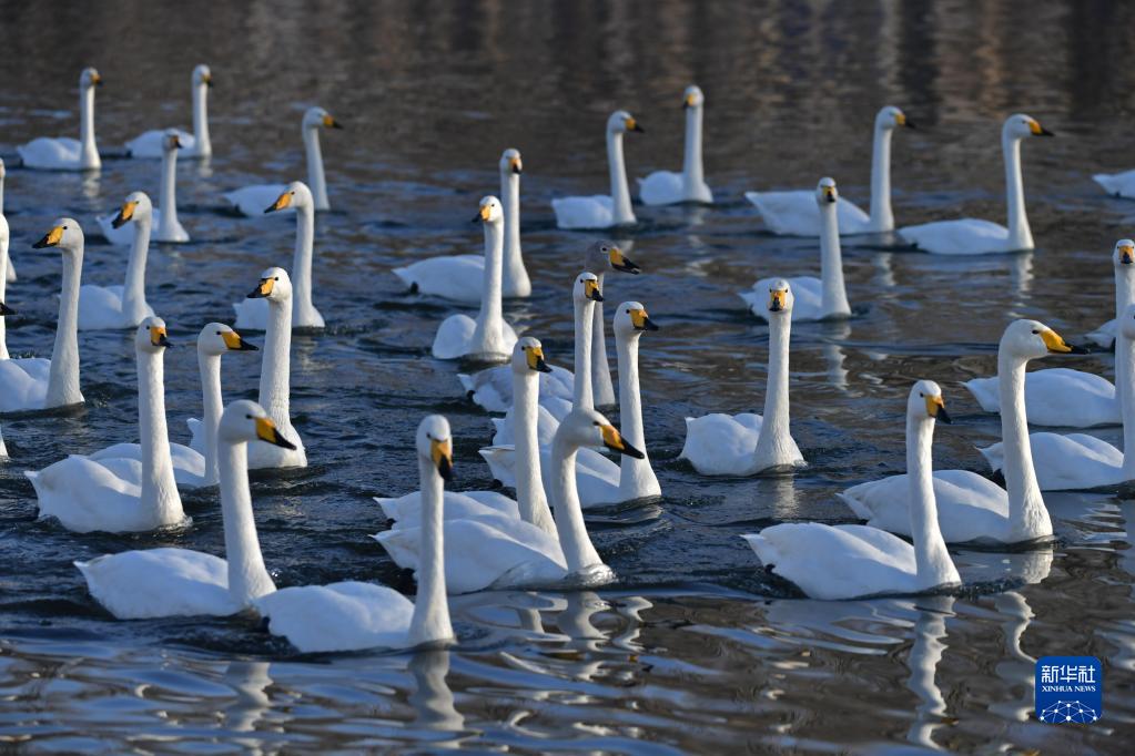 入冬以來(lái),遼寧省北票市八家子鄉紅村大凌河畔的400多只白天鵝在河水淺灘處嬉戲覓食,吸引人們前來(lái)觀(guān)賞和拍照。