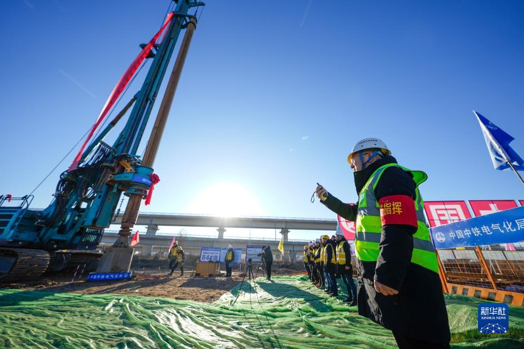 2月25日,中鐵電氣化局的施工人員在雄忻高鐵新蓋房特大橋建設現場(chǎng)指揮鉆孔作業(yè)。