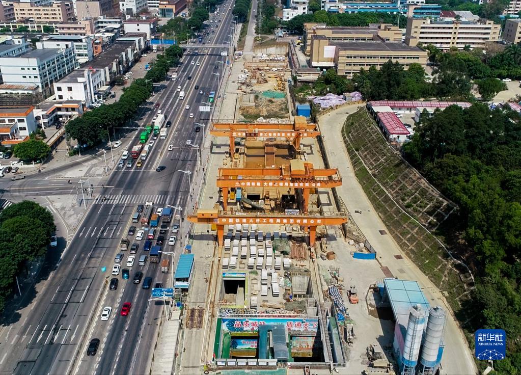 東莞地鐵1號線(xiàn)水濂山站施工現場(chǎng)(無(wú)人機照片,2月25日攝)。