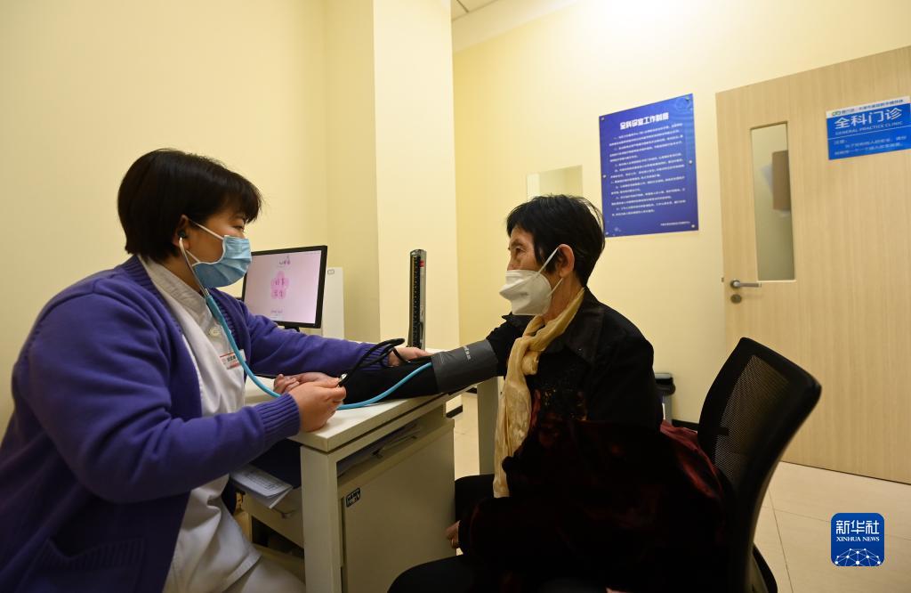 在中新天津生態(tài)城第三社區衛生服務(wù)中心,醫生在為患者測量血壓(2月24日攝)。