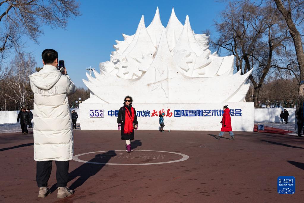 2月25日,游客在哈爾濱太陽(yáng)島雪博會(huì )園區拍照。