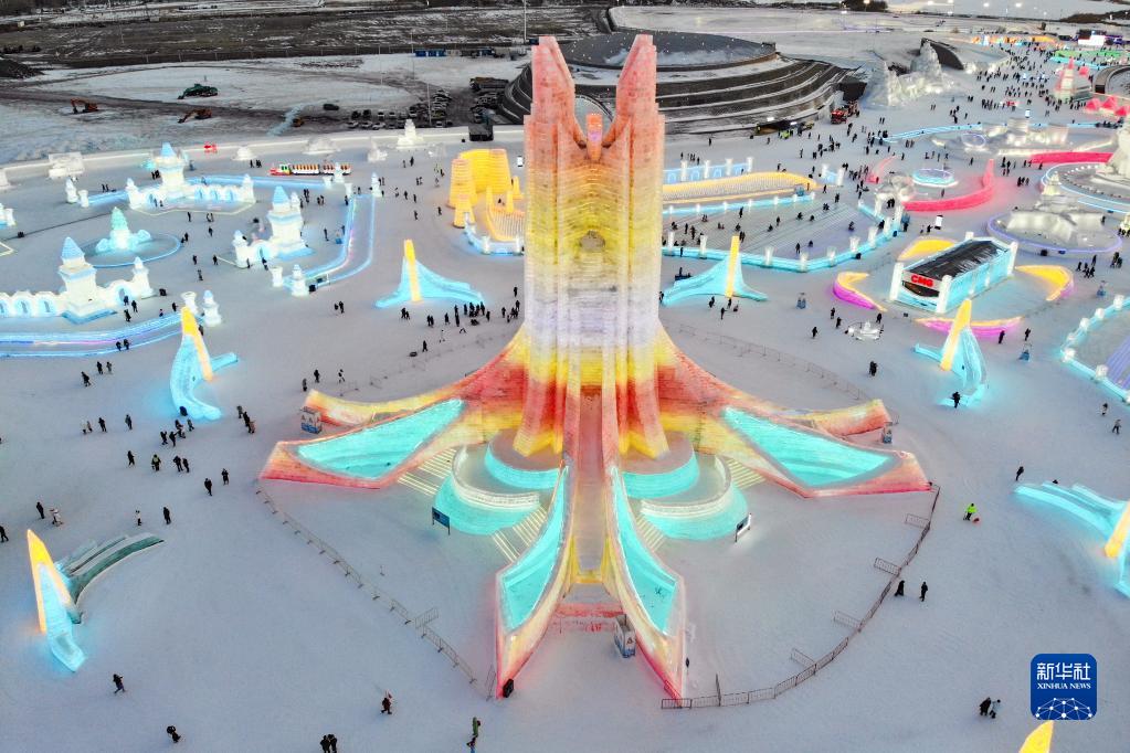 2月25日,游客在哈爾濱冰雪大世界園區游玩(無(wú)人機照片)。