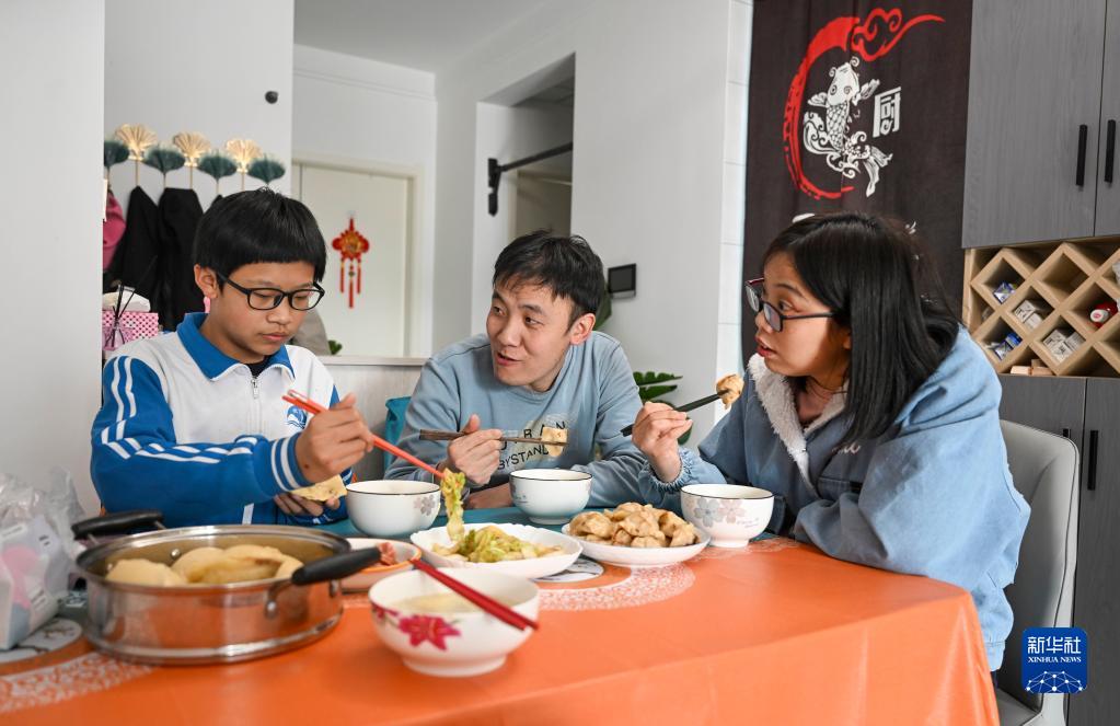 在京津中關(guān)村科技城創(chuàng )新人才社區,李麗花(右)、張建輝(中)與孩子一起吃午飯(2月23日攝)?!?5后”夫妻張建輝和李麗花曾在北京打拼多年,二人目前同在博宇(天津)半導體材料有限公司從事生產(chǎn)工作。2020年,他們落戶(hù)天津寶坻京津中關(guān)村科技城,并在配套的中關(guān)村創(chuàng )新人才社區居住,孩子也從山東老家接來(lái)身邊上學(xué),一家三口實(shí)現了同城生活。張建輝希望孩子學(xué)業(yè)有成、身體健康,李麗花希望一家人在一起的時(shí)間更多、越來(lái)越幸福。