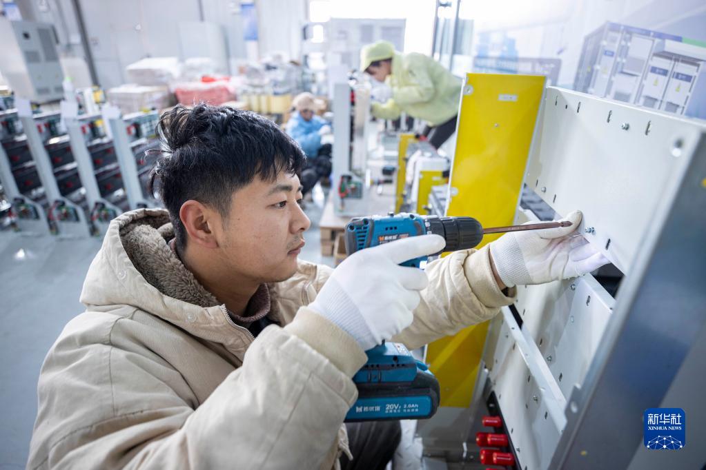 在位于寧夏同心工業(yè)園區清潔能源產(chǎn)業(yè)園的上能電氣(寧夏)有限公司車(chē)間內,工人在加工逆變器所需的配電單元(2月23日攝)。