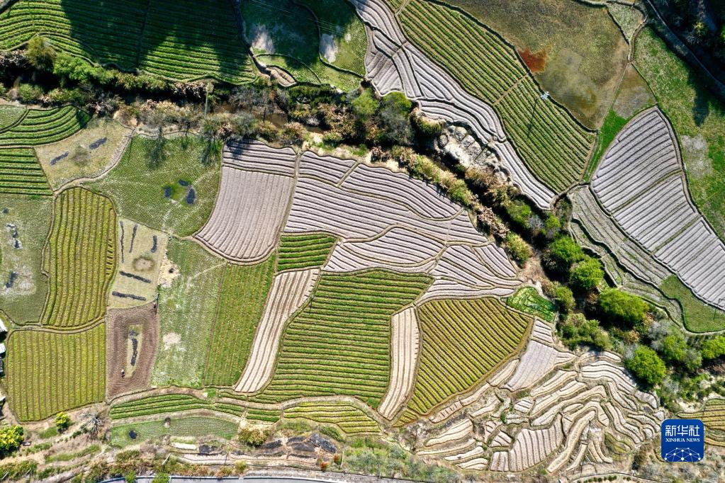春耕時(shí)節,在福建省福州市鄉村山嶺間,一塊塊形狀各異、五彩斑斕的田地猶如大地上的拼圖,呈現別樣的春耕畫(huà)卷。