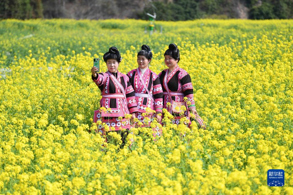 2月26日,人們在貴州省榕江縣寨蒿鎮平堡村油菜花田間賞花拍照。