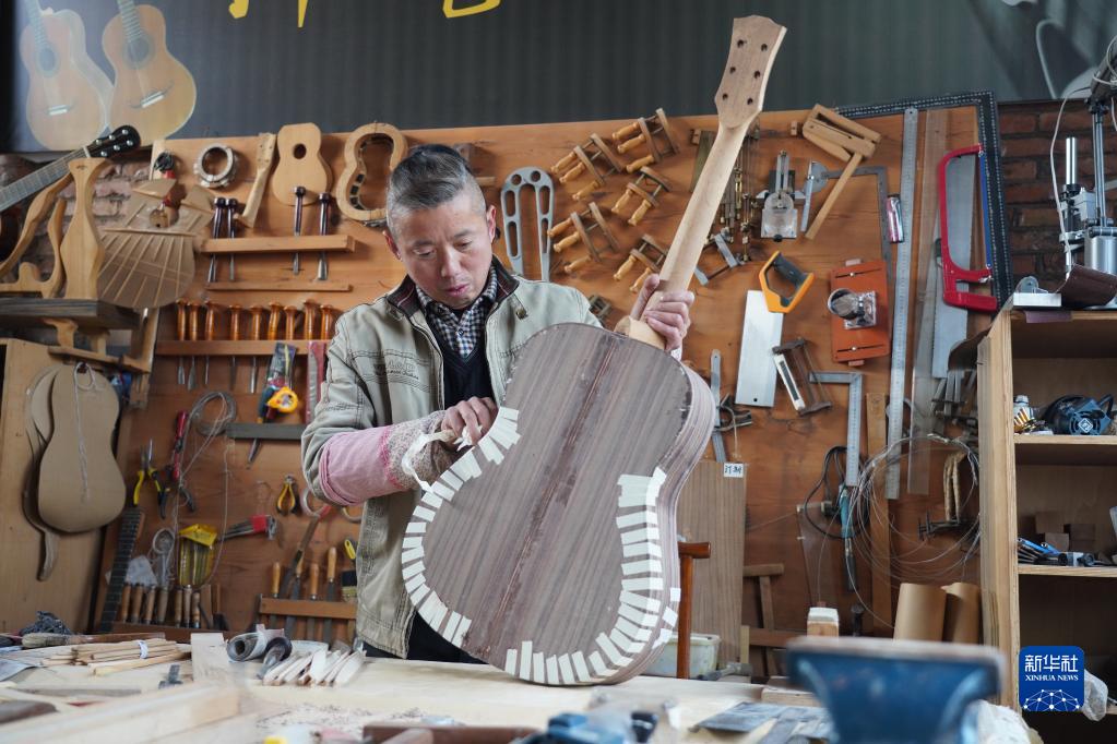 2月26日,吉他藝人在河北省武強縣周窩音樂(lè )小鎮一家吉他工坊內制作吉他。