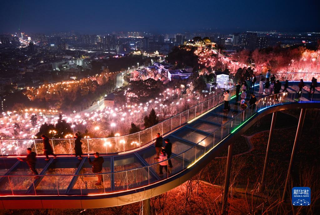 當地群眾在眉山市仁壽縣打造的“兩山一河”亮化工程觀(guān)光游覽(2月25日攝)。