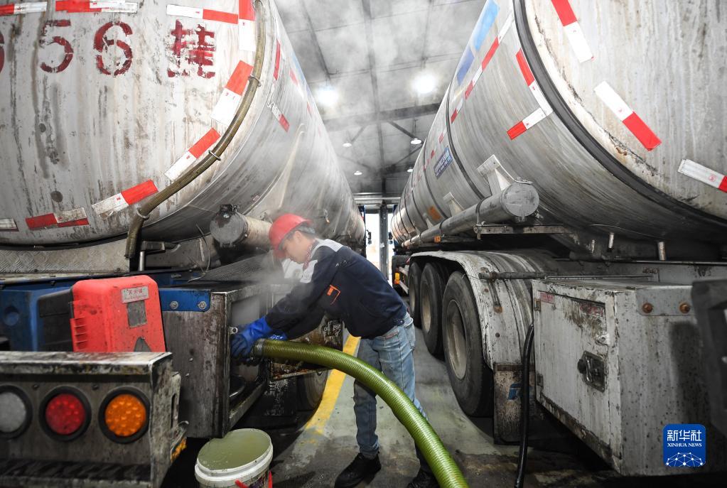 2月21日,四川一家環(huán)??萍加邢薰締T工將油罐車(chē)運來(lái)的餐廚廢油轉送至生產(chǎn)線(xiàn)。