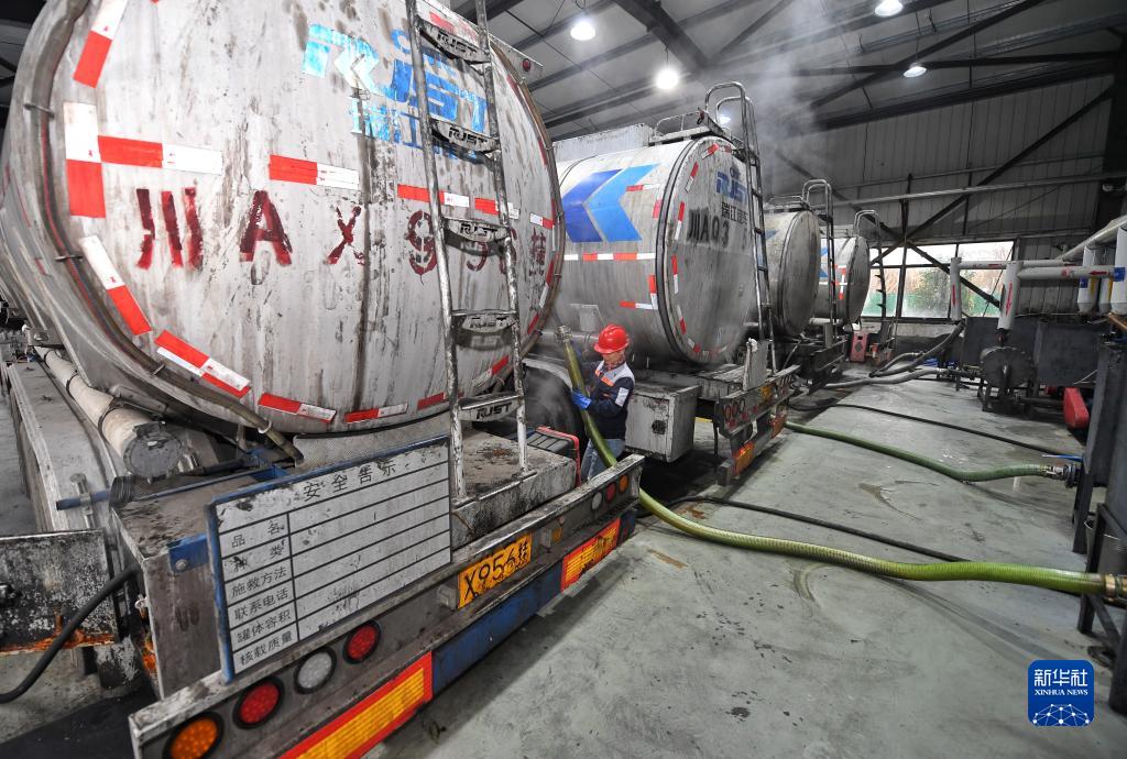 2月21日,四川一家環(huán)??萍加邢薰締T工將油罐車(chē)運來(lái)的餐廚廢油轉送至生產(chǎn)線(xiàn)。