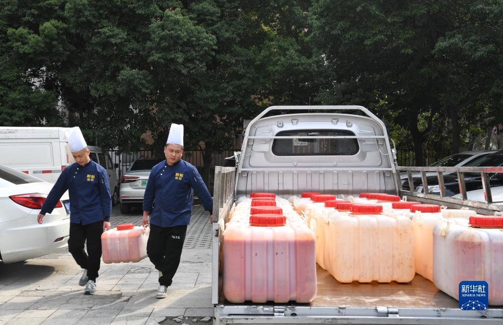 2月25日,成都一家火鍋食府員工將收集的廢油搬上運輸車(chē)。