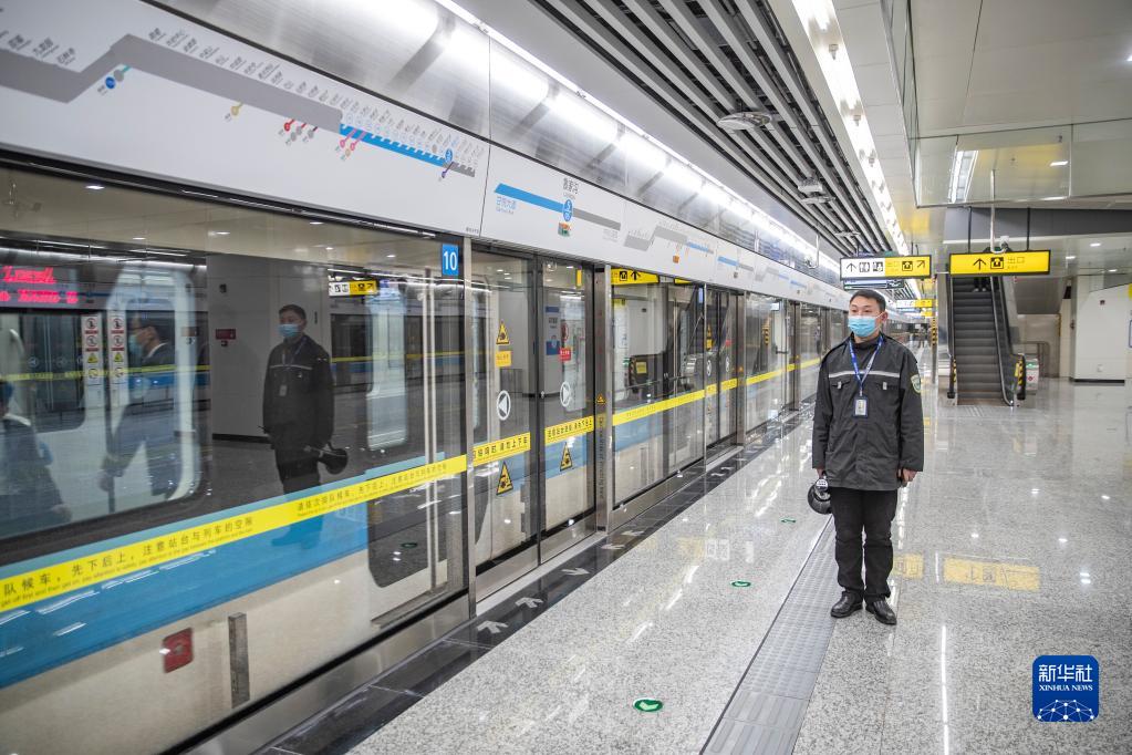 2月27日,在重慶軌道交通5號線(xiàn)北延伸段魯家溝站,工作人員在站臺工作。
