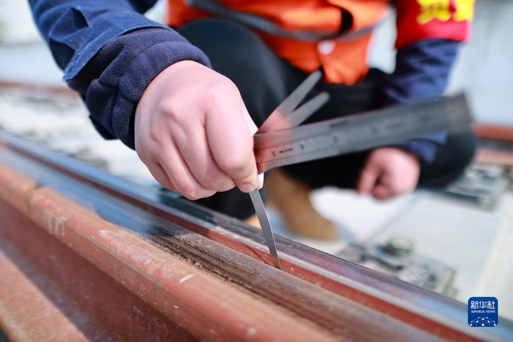 2月27日,在貴南高鐵都勻東站附近,貴陽(yáng)高鐵工務(wù)段的技術(shù)人員使用塞尺對道岔縫隙進(jìn)行檢測。