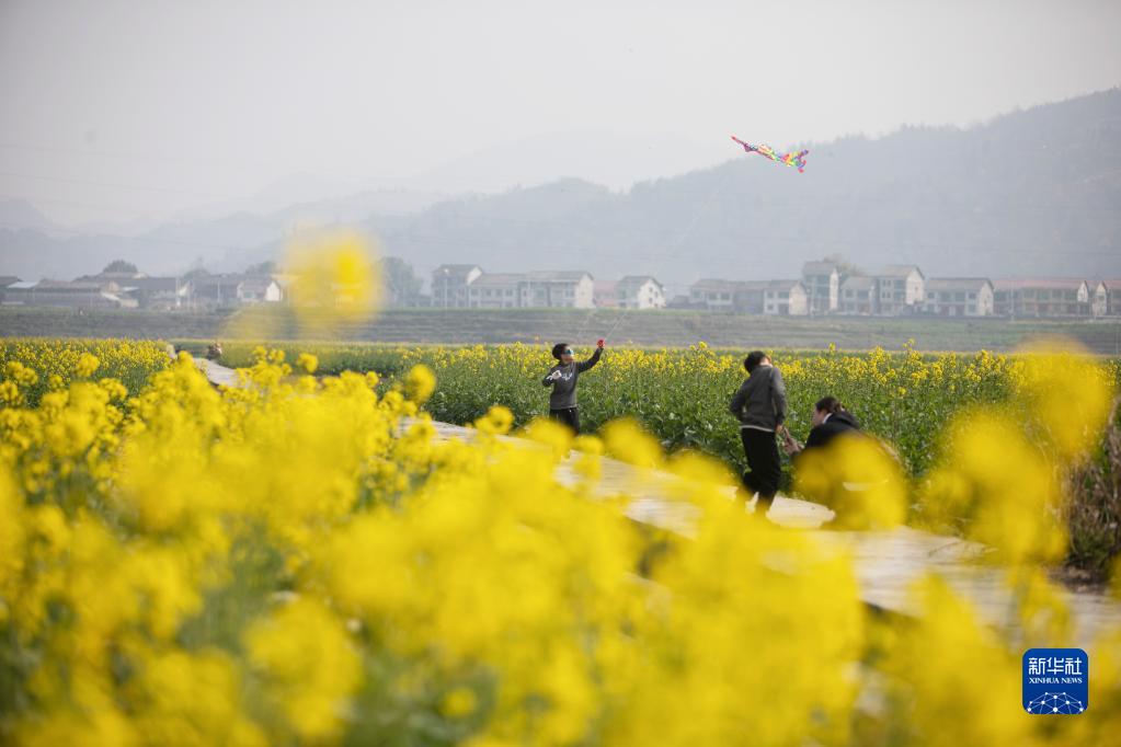 2月26日,在重慶秀山土家族苗族自治縣清溪龍鳳花海景區,小朋友在油菜花田間放風(fēng)箏。