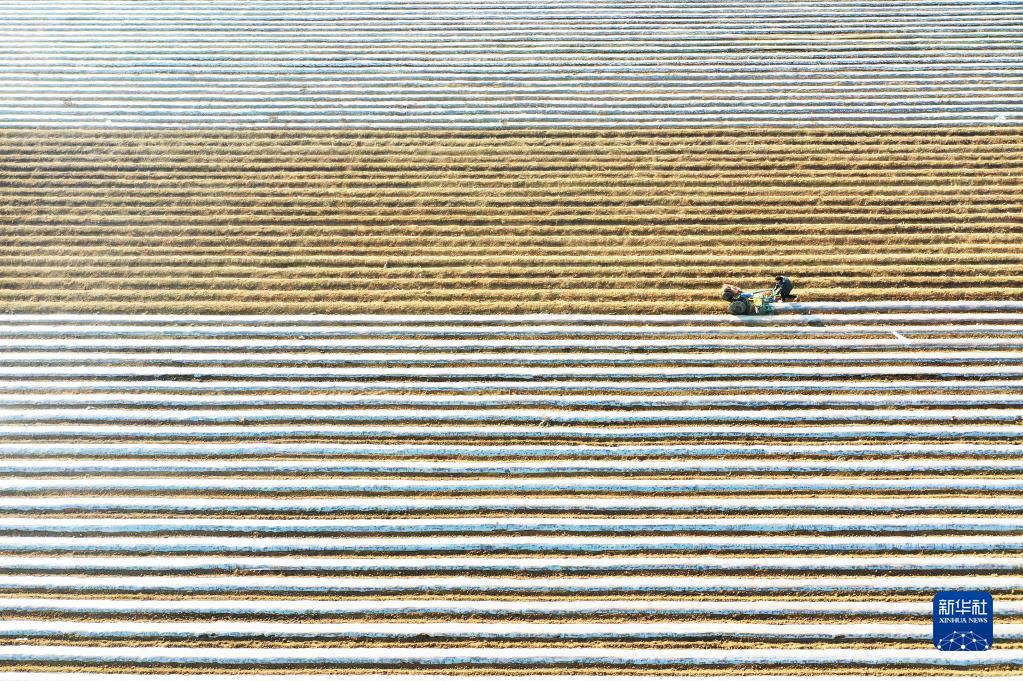 2月27日,山東棗莊山亭區戶(hù)口村農民駕駛農機在田間覆膜播種馬鈴薯(無(wú)人機照片)。