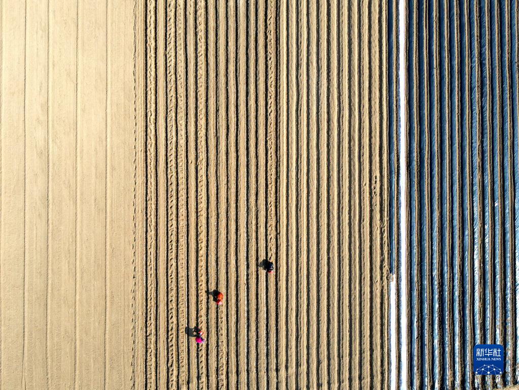 2月27日,山東省臨沂市平邑縣地方鎮農民在田間勞作(無(wú)人機照片)。