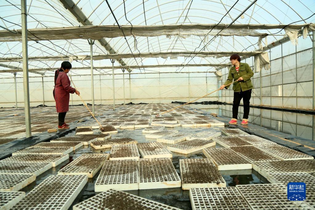 2月27日,河南省洛陽(yáng)市汝陽(yáng)縣劉店鎮沙坪村農民在溫室大棚進(jìn)行漂浮育苗,為春耕生產(chǎn)做準備工作。
