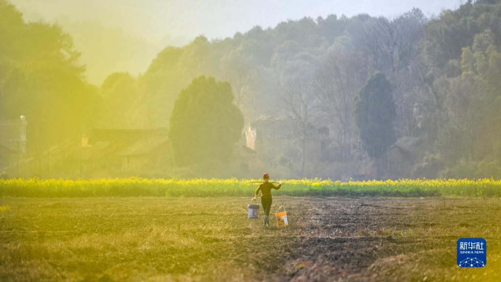2月27日,湖南省常寧市西嶺鎮西沖村農民在田間挑運肥料。
