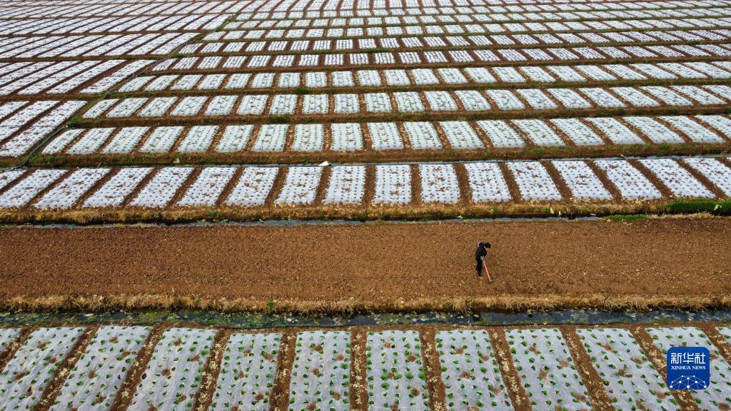 2月28日,菜農在云南省曲靖市沾益區西平街道的蔬菜種植基地平整菜地(無(wú)人機照片)。