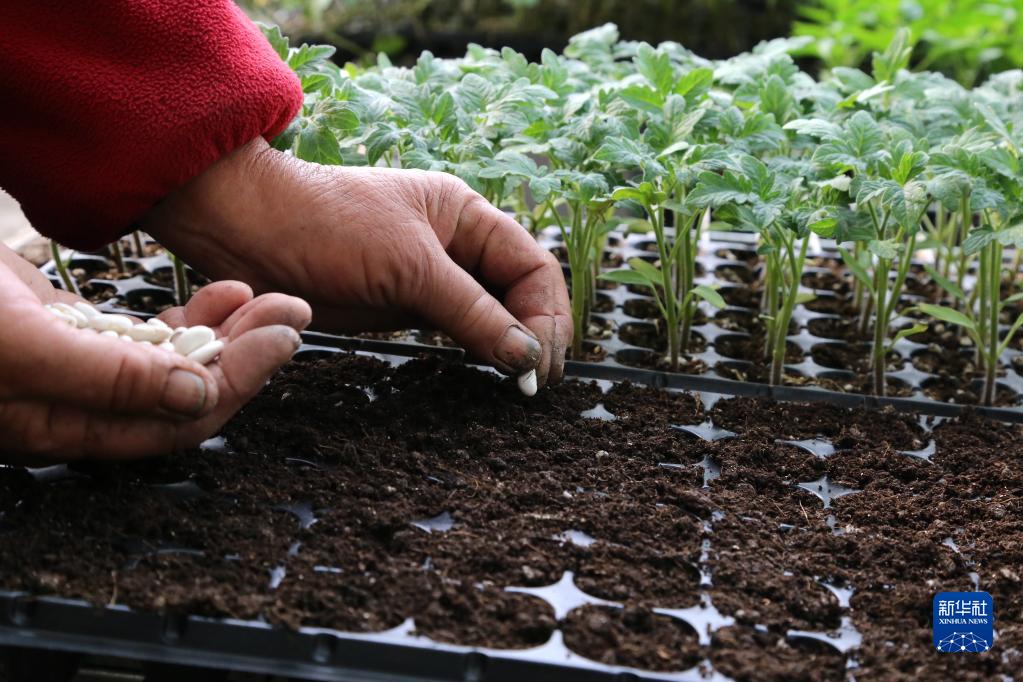 2月28日,山東省濱州市惠民縣淄角鎮獅豹劉村農民在育苗大棚內播種蕓豆種子。