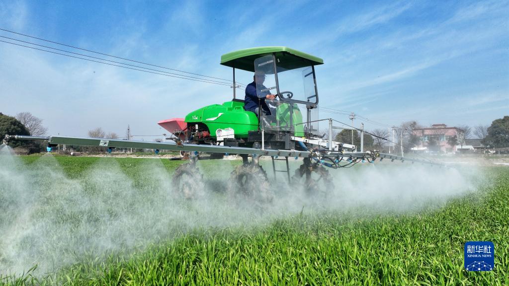 2月28日,在浙江省湖州市德清縣禹越鎮天皇殿村,農民駕駛自走式高桿噴霧機對小麥進(jìn)行噴藥作業(yè)(無(wú)人機照片)。