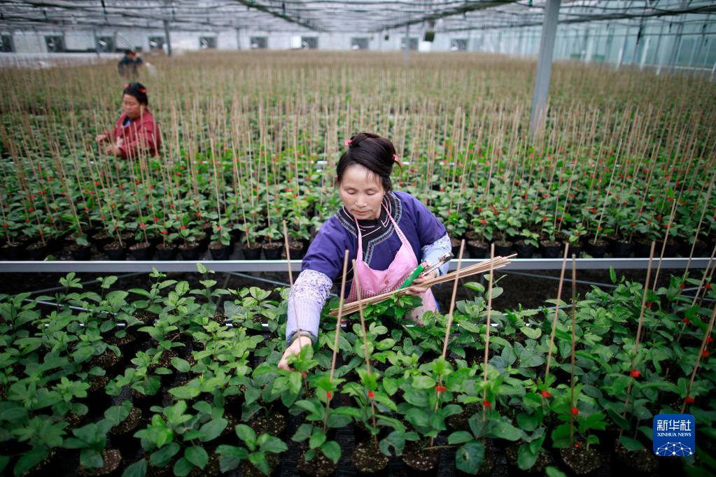 2月28日,一名少數民族婦女在大棚內對百香果苗進(jìn)行管理。