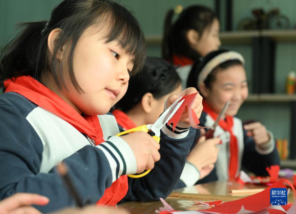 2月28日,學(xué)生在石家莊市東風(fēng)小學(xué)非遺工坊學(xué)習剪紙。