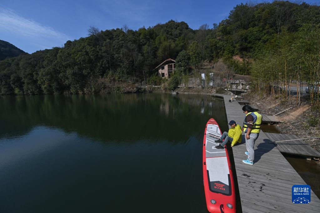 2月28日,在杭州市臨安區玲瓏街道前山村51Camp營(yíng)地,負責人丹裕(左)在教一名游客如何使用槳板。
